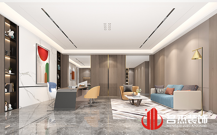 整體辦公室裝修設計當中加入了很多不同的造型,讓空間變得更加有設計感。展廳區域則使用弧形吊頂造型,讓流動路線跟著弧線走,起著一個引導的作用,有著更深的沉浸感。螺旋式樓梯因其流線造型美觀,且有著典雅的氣息,深受客戶的喜愛。休閑區域則使用較為傳統的樣式,綠植,鵝卵石鋪墊的過道,空間中無處不透露著中式典雅的風格。