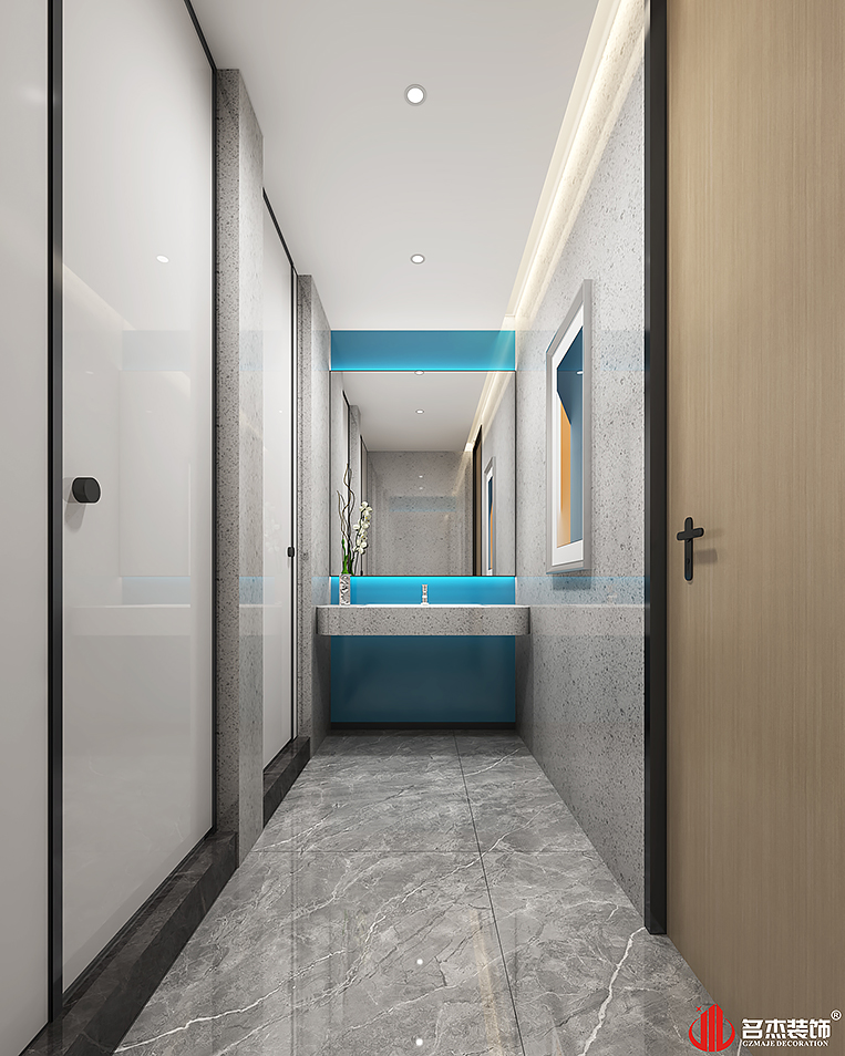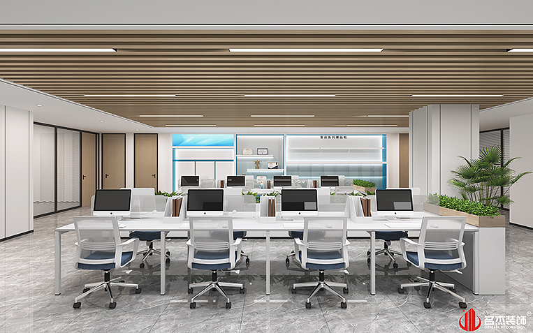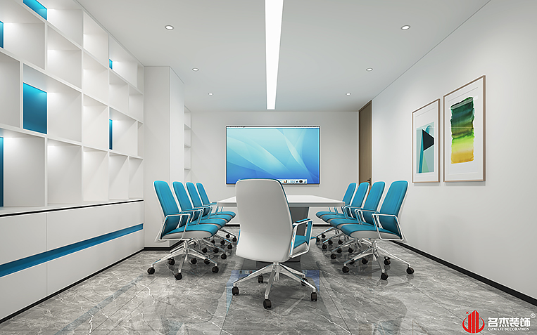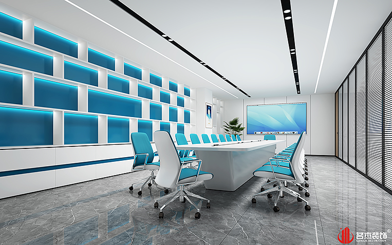 前臺區域利用層高的優勢,搭建出一個大氣且時尚的區域。在背景墻部分加入部分簡約的且不簡單的元素,讓空間變得更加有層次感,土豪金作為空間的點綴色,也為這個前臺區域增加了不少的輕奢感。大部分區域都是做了吊頂的,通過這樣的方式讓整體風格得到了統一,同時這樣簡約的吊頂也能夠給空間帶來不一樣的層次感??臻g中藍色點綴也是隨處可見的,能夠很好的感受到企業文化。#工裝裝修#