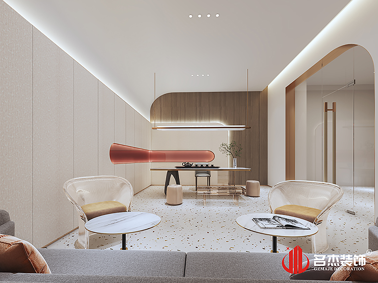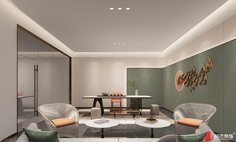 在前臺區(qū)域使用圓頂造型的天花來作為整個辦公室裝修設(shè)計空間的點睛之筆,同時配波浪板的背景墻,讓人有一種仿佛置身大海一般。在接待室里面選擇性地使用圓弧線條,加以莫蘭迪色系以及護(hù)墻板的,燈帶的恰到好處地使用,讓接待室的休閑感和柔和感更加濃郁。而在另一個接待室則是采用不一樣的設(shè)計處理手法,以直的元素作為主打元素,同時也搭配莫蘭迪色系作為點綴色系,也更突出空間的休閑感。