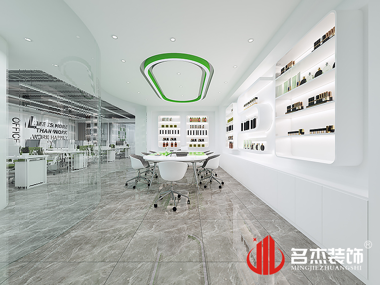 整體設計以白色作為主設計基調,加以綠色作為點綴色,讓空間的綠色環(huán)保感覺一下子就出來了。而且加入圓弧形元素能夠讓空間更加有設計層次感。在展廳區(qū)域使用玻璃隔墻來增加整體空間的通透感,同時能夠增強視覺上的觀感。