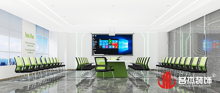 整體辦公室裝修設計中以綠色作為主打顏色,加入到各個區域當中,來凸顯整個企業的發展思路。在展廳區域中加入不同的造型來凸顯出整體的時尚感,也更加突出空間的設計感?,F代簡約風格很好的表達出企業的愿景,以及對未來發展的規劃,從而引導企業走向更好的未來。