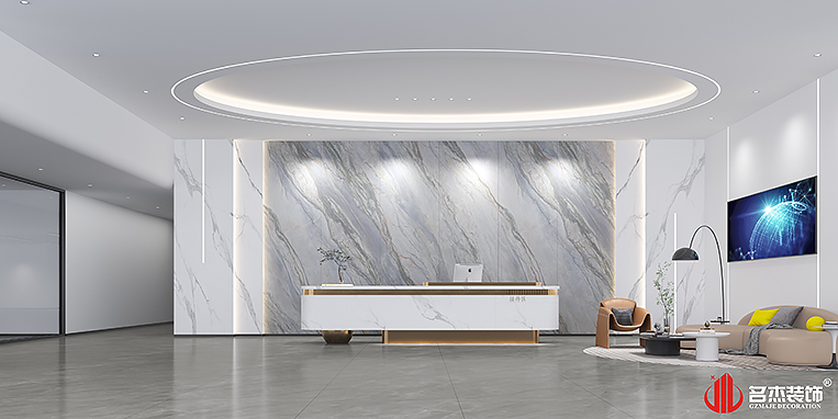 前廳是整個辦公裝修設計空間的一大亮點,前臺背景墻大理石條紋的拼接組合打破了原本傳統的設計,大理石紋路與燈飾的配合,碰撞出了不一樣的火花,加上嵌入燈帶的配合,使整個空間充滿靈動。圓形吊頂也能夠讓空間煥發出不一樣的設計層次感,兩者相互配合,共同打造出一個特別的辦公場景。