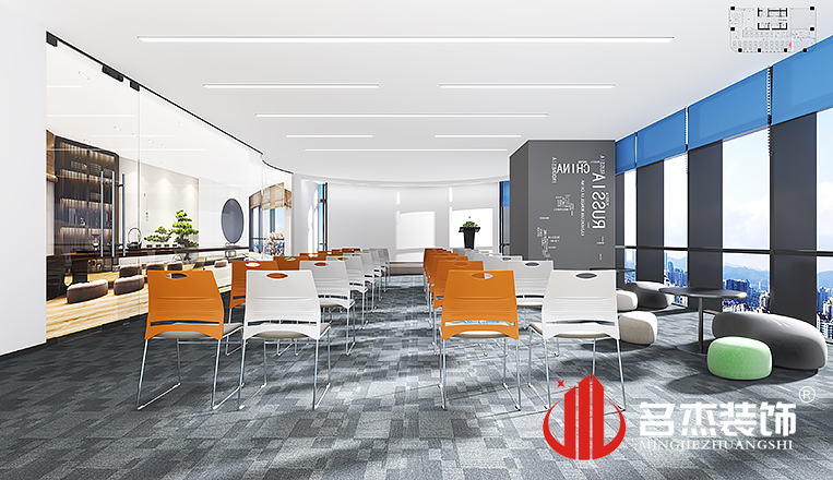 整個辦公室裝修設計空間所營造出來的風格,是普通時尚簡約風格做不到的。多種色彩的引入,讓空間更有層次感,而且簡約的天花吊頂是可以讓空間的造型顯得不那么單調。同時將部分的園林元素加入到休閑區當中,讓員工能夠在一個舒適放松的環境下,身心得到完全的放松。