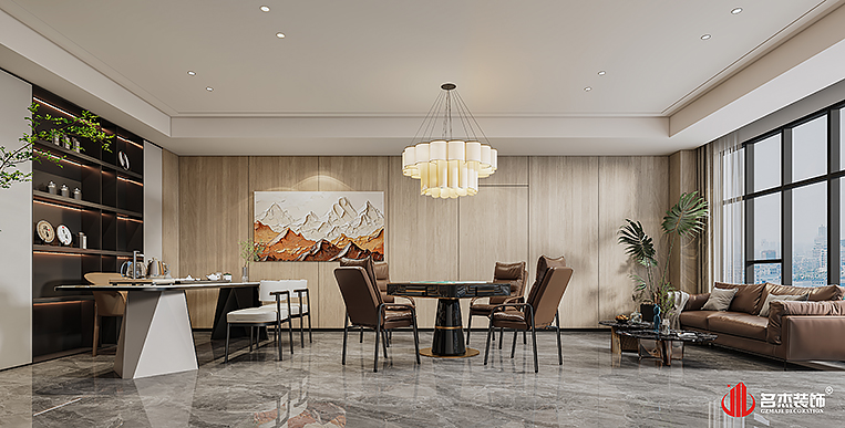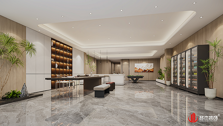 空間中的前臺(tái)接待區(qū)域使用造景的設(shè)計(jì)手法,來突出風(fēng)生水起的設(shè)計(jì)重點(diǎn),配合前臺(tái)背景墻使用的碳晶板,以及燈條作為點(diǎn)綴設(shè)計(jì)元素,搭配出不一樣的裝修設(shè)計(jì)效果。對(duì)于棋牌休閑空間來說,燈光是非常重要的元素之一,因此設(shè)計(jì)團(tuán)隊(duì)也著重在這方面上的設(shè)計(jì),通過使用造型不同的燈具,為空間增加了不少的時(shí)尚潮流感。#廣州公裝裝修公司#